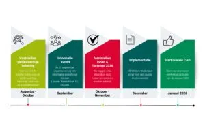 En dat brengt ons bij de nieuwe CAO. De nieuwe cao loopt van 1 januari 2026 tot en met 31 december 2028. Gelijkwaardige beloning zal centraal komen te staan. Alles wat vaste medewerkers aan arbeidsvoorwaarden krijgen, moet minimaal gelijkwaardig zijn bij de uitzendkracht.